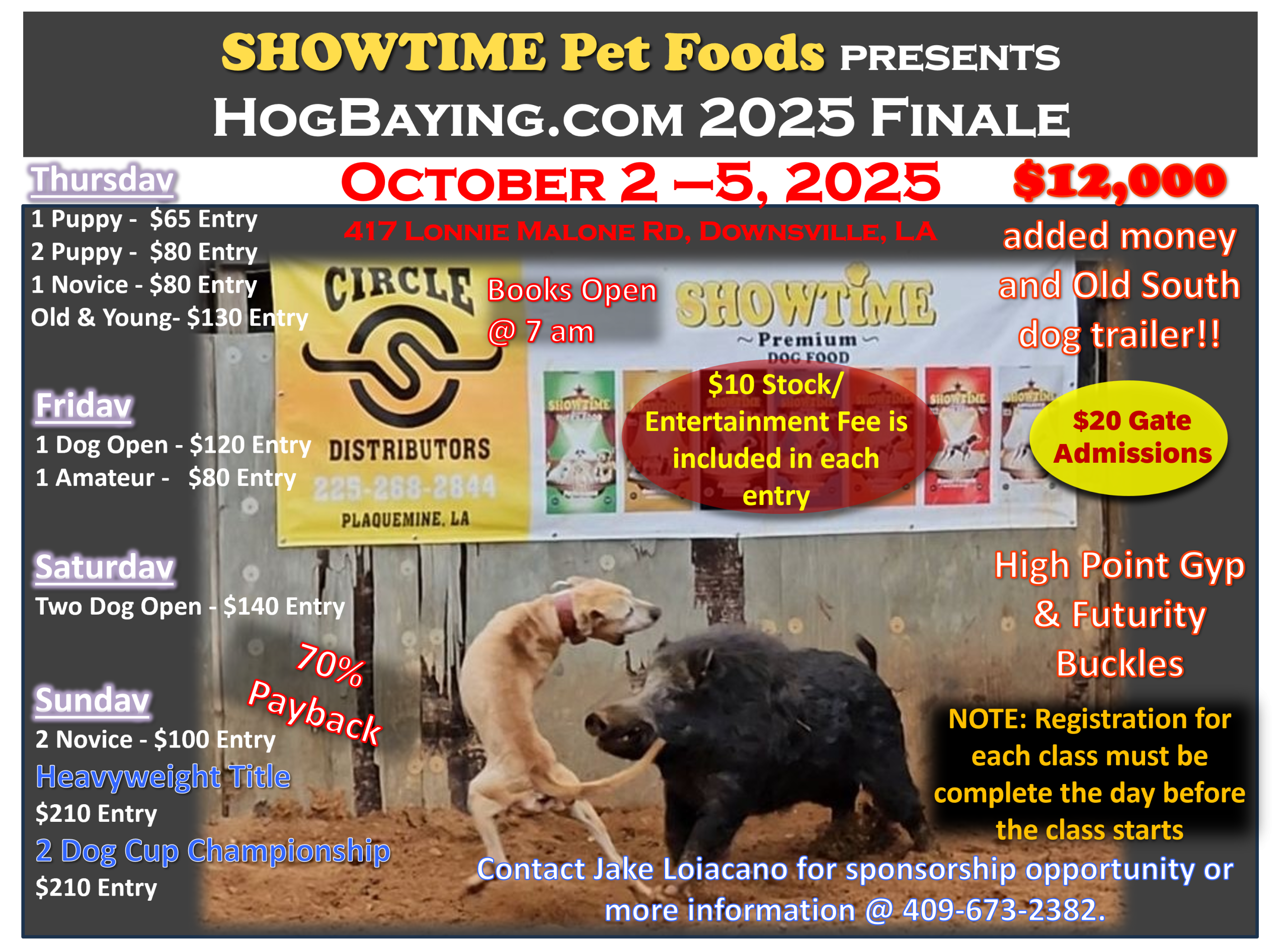 - 2025 SHOWTIME PET FOODS KENNEL STANDINGS Aug 20252025 SHOWTIME PET FOODS Kennel Standings 2025 SHOWTIME PET FOODS WORLD CHAMPIONSHIP OF HOG BAYING 1.Goose 46 Top Gun 2.Fanboy 35 Top Gun …